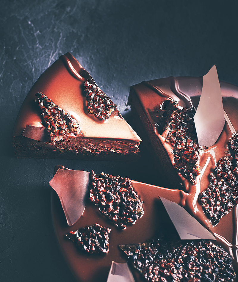 Retirer le ruban PVC, poser le cercle sur une grille et napper aussitôt avec le glaçage chocolat. Retirer l’excédent à l’aide d’une spatule en inox et laisser prendre environ 30 secondes. Décorer avec des éclats de nougatine.