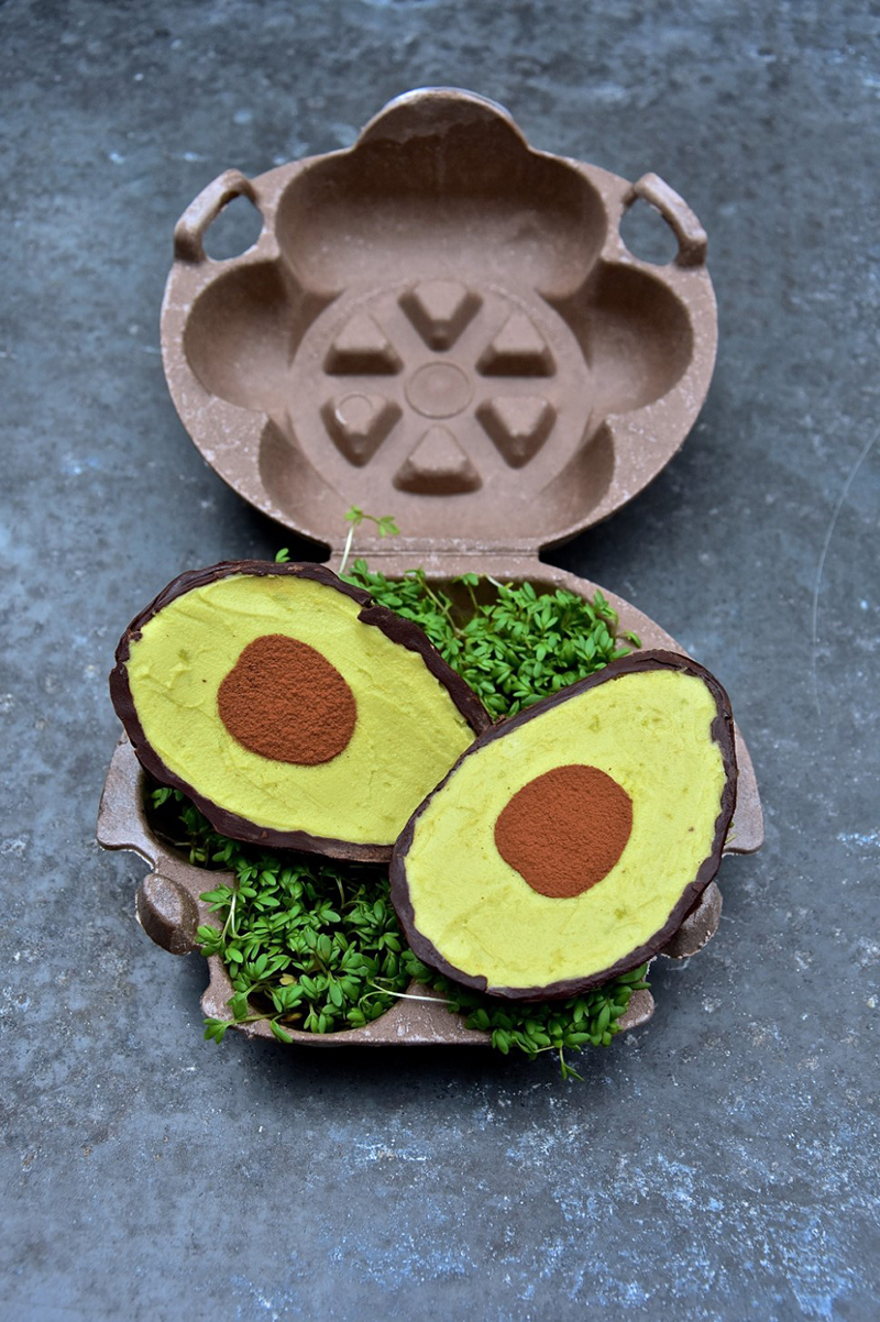 ⑤• Une fois que le chocolat est ferme, séparez-le délicatement de la coque de l’avocat et de la glace pour obtenir une belle coque en chocolat. Retirez l’excès de chocolat avec un couteau aiguisé et faites en sorte que l'œuf ressemble à un véritable avocat. dans les assiettes, puis terminez en ajoutant le pesto, le parmesan, les feuilles de basilic et d’origan.