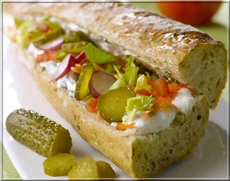 Refermer le sandwich avec la seconde moitié de baguette tartinée du mélange à base de faisselle.