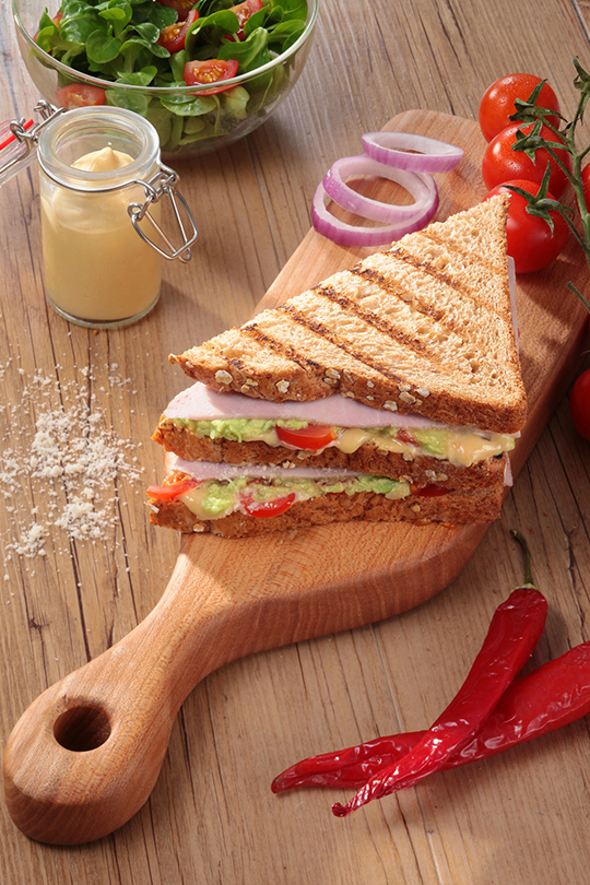 ④• Badigeonnez légèrement les tranches de pain d’un peu d’huile d’olive. Sur une des tranches, étalez la moutarde puis posez les tranches de tomate, l’avocat et 1/2 tranche de jambon. Recouvrez avec l’autre tranche de pain de mie puis recommencez une nouvelle fois ces étapes. Parsemez le dessus de la dernière tranche de pain avec un peu de parmesan.