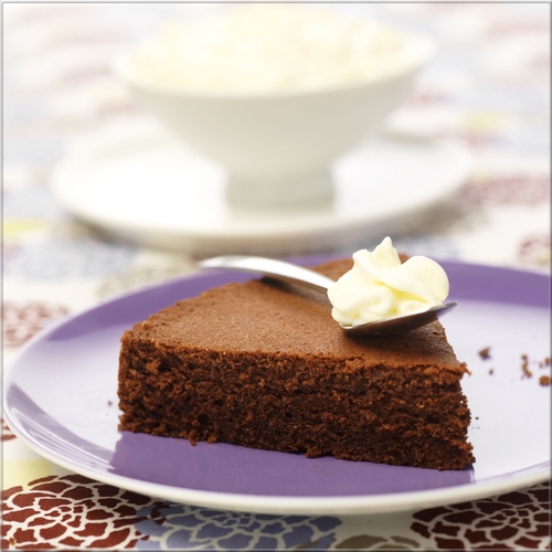Je démoule le gâteau encore chaud et le sers avec de la crème chantilly.