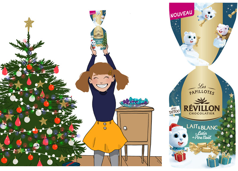 Parce qu’elle ne cache pas son amour pour les chocolats, Louise, quant à elle, préfère choisir un généreux sachet de papillotes aux petites mascottes rigolotes : deux délicieuses recettes fondantes au chocolat blanc qui pétille et au lait pour régaler les papilles ! Nichées dans un joli sachet aux illustrations ludiques, emballées dans un papier scintillant et cachant un tatouage éphémère, ces papillotes sont la garantie d’instants magiques et gourmands.