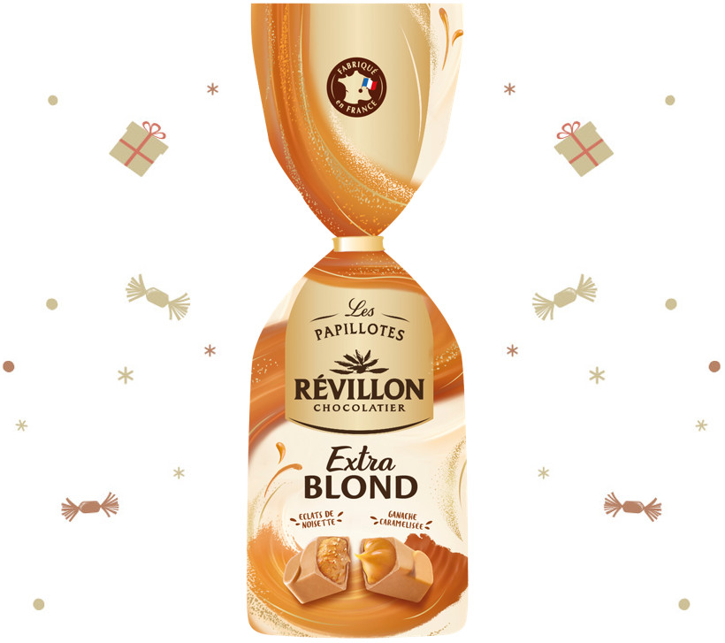 Cette nouvelle papillote haut de gamme doit sa douce teinte blonde à une caramélisation du chocolat blanc qui, en bouche, offre de renversantes notes de biscuit et de caramel.