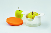 Composé de trois éléments distincts, cet ustensile est ultra fonctionnel. A l’aide de poignées sur lesquelles s’appuyer, la partie centrale découpe facilement des quartiers réguliers et enlève le trognon ; les morceaux de fruits peuvent ensuite être récupérés dans un récipient qui se ferme avec son joli couvercle orange bien sûr. Plus d’excuses pour ne pas manger de fruits au bureau ou à l’école !