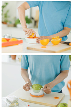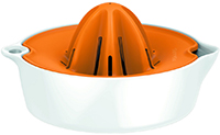 Très design, cet ustensile possède une partie presse-fruit d’une jolie couleur orange qui peut se retourner pour se loger dans le réceptacle blanc et ainsi se ranger très facilement. Un anneau antidérapant en silicone orange, sous le réceptacle, permet de presser son fruit sans faire glisser l’ensemble !