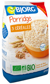 Le nouveau Porridge 3 Céréales Bjorg est un savoureux mélange de flocons d'avoine, de blé et d'épeautre. Petit-déjeuner complet, il se consomme volontiers avec une boisson végétale et s'associe selon les goûts de chacun.