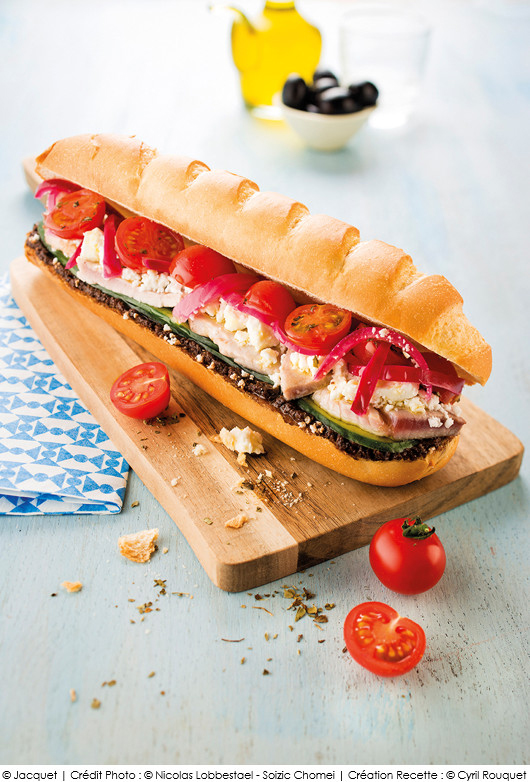 ⑥• Ouvrir les Baguettines en deux et tartiner avec la pâte d’olives, ajouter les tranches de concombres, 6 tranches de thon snacké, la feta émiettée, les pickles d’oignons rouges égouttés.
