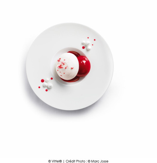 La meringue est aux pralines rouges pour donner un peu de croquant, la glace aux baies rouges surprend avec des saveurs de litchi pour un côté innovant et la texture du coulis sublime le tout.