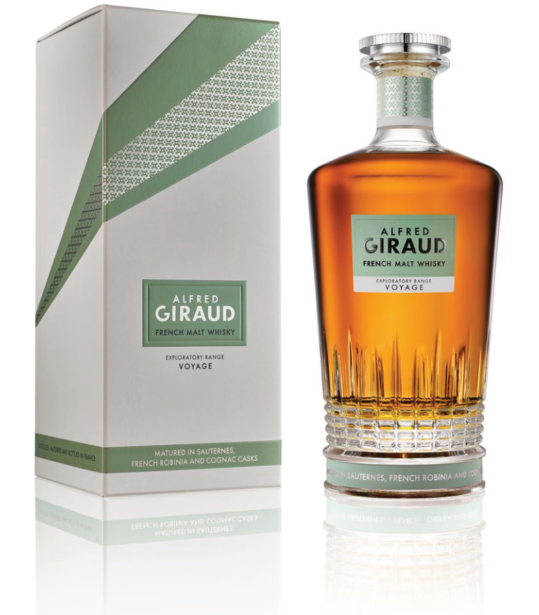 VOYAGE met en lumière tout l’esprit d’aventure qui habite le whisky Alfred GIRAUD, avec son profil aromatique audacieux, fruit d’un assemblage unique de deux single malts de très haute qualité et de fûts qui bousculent les conventions établies. Un premier single malt a été vieilli dans des fûts de Sauternes, lui conférant ainsi des notes de crème anglaise, de raisin sucré et de miel d’acacia, le second dans des fûts de robinier français, un bois puissant qu’Alfred GIRAUD est le premier à maîtriser dans la production de whisky. Ce dernier apporte de délicates notes florales.