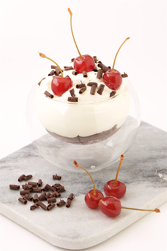 ⑥• Pour le montage, placez dans le fond des verrines un peu de concassé de cerises à l’eau-de-vie, couvrez à l’aide d’une belle tranche de gâteau au yaourt, complétez avec la mousse de yaourt et parsemez le tout de copeaux de chocolat et des cerises restantes.
