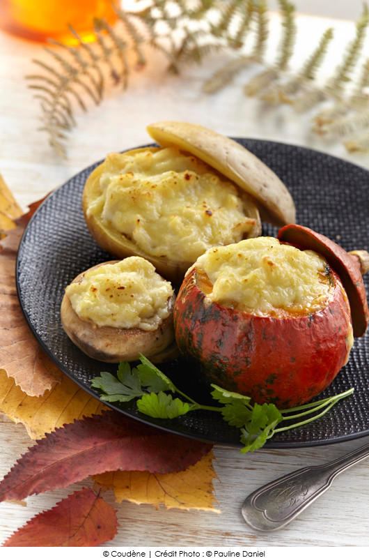 ⑤• Garnir les champignons et les pommes de terre de la préparation à base de brandade, ajouter un peu d’Emmental râpé sur les dessus.