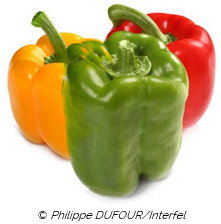 • Variété de piment doux, le poivron produit de gros fruits, frais et colorés.