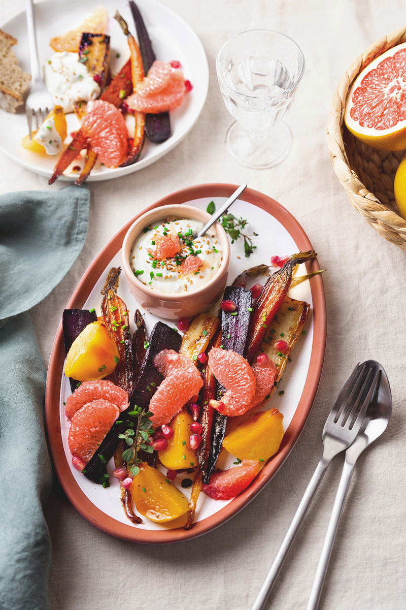 ⑧• Une fois que les légumes sont cuits, disposez-les dans le plat de service. Rajoutez les suprêmes de pamplemousse de Floride, les graines de grenade et de la ciboulette ainsi qu’un filet d’huile d’olive.