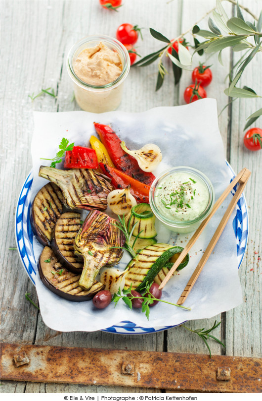 ①• Laver les légumes. Couper les courgettes en grandes lamelles, les poivrons en quarts, les aubergines en rondelles et enlever la première peau des oignons nouveaux. Ôter les premières feuilles des artichauts, couper l’extrémité puis faire cuire 3 min dans de l’eau citronnée. Badigeonner tous les légumes d’huile d’olive.