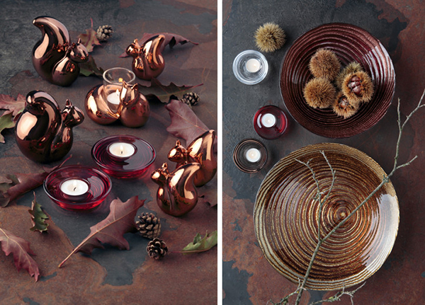 Les différents objets pour la table et la décoration sont mis en valeur par des matériaux nobles comme le verre, le bois ou le cuivre.