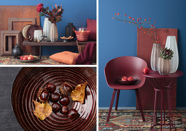 Les teintes chaudes comme le carmin, le brun foncé et le cuivre sont un enchantement, à mixer avec tous les bleus ; turquoise, canard ou pastel.