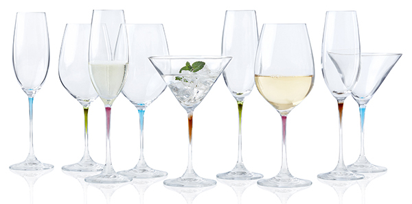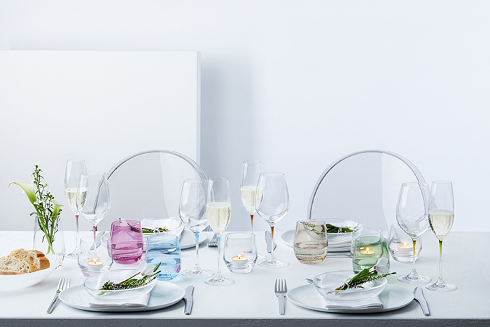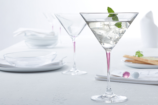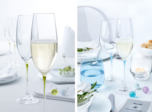 Le résultat, des verres à vin, des coupes à cocktail et des flûtes à champagne aux nuances douces et précieuses, telles que le Vert frais, le Bleu Lagune froid, le Violet impertinent et le Marron chaud.