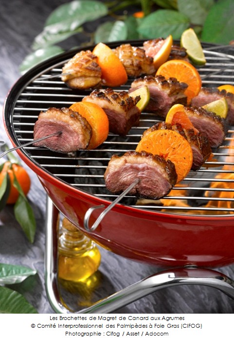 4• Enfiler les morceaux de Magret et les quartiers d’agrumes en les intercalant sur de grandes brochettes. Poivrer au moulin.