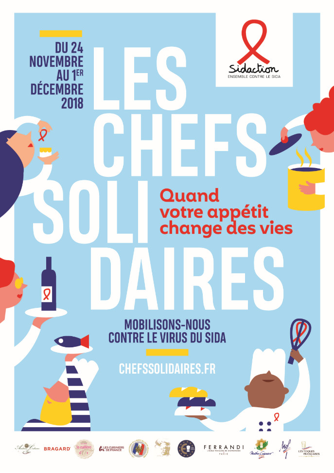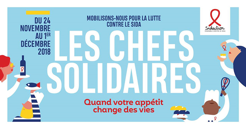 Initiée en 2009 par Line Renaud, vice-présidente de Sidaction, l’opération « Chefs Solidaires » a lieu cette année du samedi 24 novembre au samedi 1er décembre, journée mondiale de la lutte contre le sida. L’occasion pour tous les professionnels des métiers de bouche de soutenir Sidaction et la lutte contre le virus du sida.