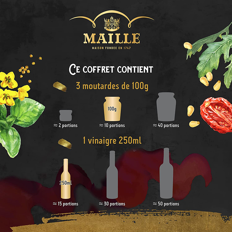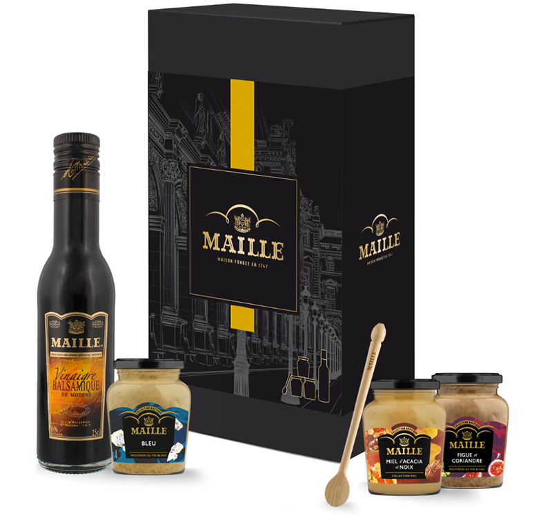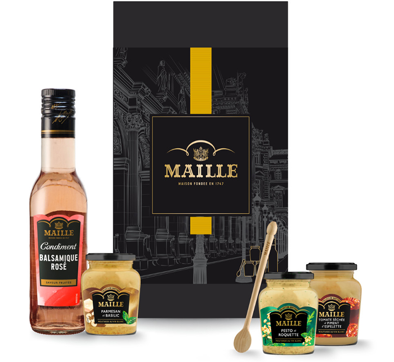 Chaque coffret contient 3 pots de moutarde Maille et un flacon de vinaigre ou condiment balsamique, afin de décupler le plaisir de la dégustation. Pour compléter l’ensemble, ce coffret comprend aussi une élégante spatule en bois de la Tournerie Patel, entreprise artisanale du Jura. Fabriquée et gravée à la main, elle est aussi polie naturellement à la cire d’abeille.