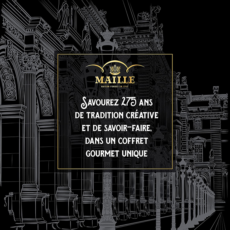 Ancrée dans le patrimoine français depuis plus de 275 ans, la Maison Maille® allie l'expertise et la passion, héritées des maîtres moutardiers et vinaigrier, pour sublimer vos repas. La Maison Maille® est fondée par Antoine-Claude Maille, maître vinaigrier, qui ouvre sa première boutique à Paris en 1747, où l’on peut découvrir la richesse de ses moutardes aromatisées. Il devient ensuite le fournisseur officiel de la cour du roi Louis XV et accède ainsi à la célébrité. Héritiers d'une créativité cultivée depuis près de 3 siècles, les chefs de la Maison Maille® conçoivent chaque recette comme une œuvre d'art culinaire. Pour Maille®, l’alimentation est bien plus qu’un moyen de subsister, la gastronomie, c'est un art de vivre. Il nous appartient d’inspirer les créatifs, les bons vivants exigeants et les curieux pour, sans cesse, imaginer de nouvelles saveurs et sublimer les repas.