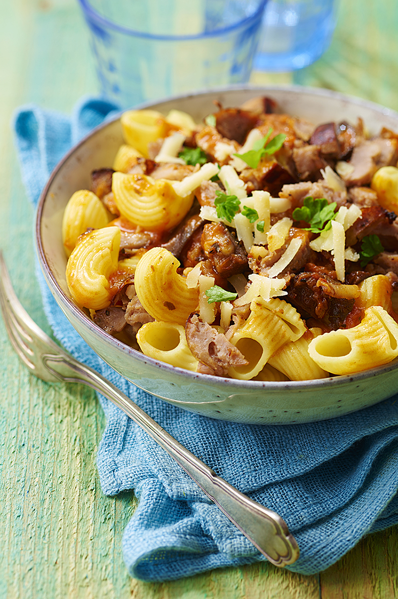 Les Coudes rayés aux aubergines confites, Beaufort et saucisse de Toulouse
