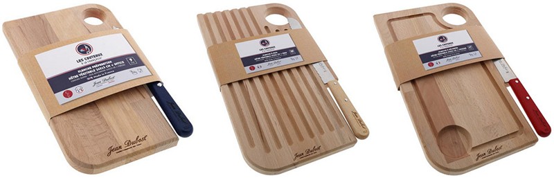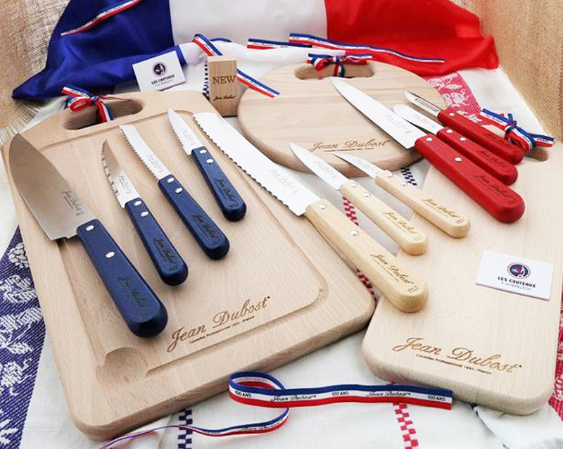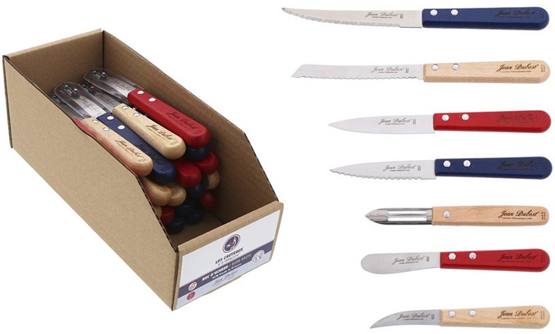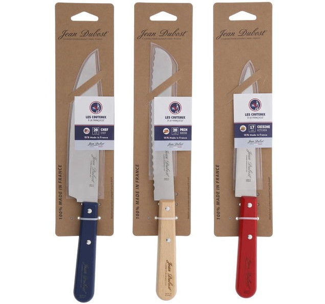 – Vendus sur carte en carton recyclé, en display carton recyclé et meuble de présentation dédié "Jean Dubost Les couteaux à la Française®