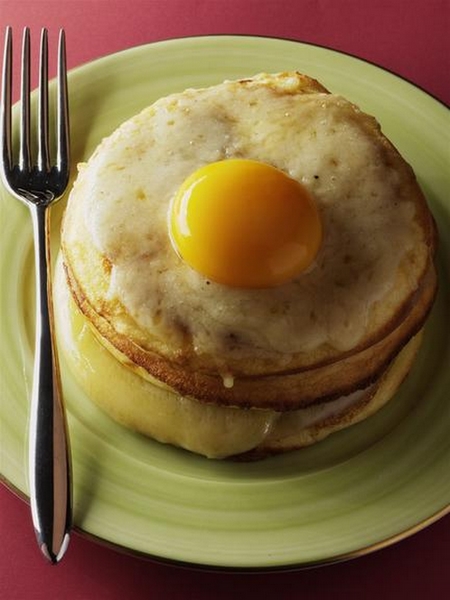 Monter le gâteau en intercalant une crêpe une tranche de jambon, une tranche de cantal, une noisette de beurre et ainsi de suite jusqu’à la troisième crêpe.