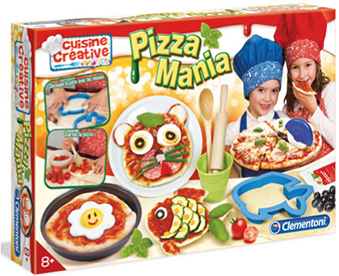 Les jeux Clementoni étant italiens, la gamme Cuisine Créative ne pouvait pas passer à côté de la  Pizza Mania ! Margherita, Reine ou Calzone ? Les enfants peuvent laisser libre cours à leur créativité pour concevoir la pizza de leurs rêves ! Pâte à pizza, rouleau à pâtisserie, verre doseur, moule, manique, toque, tablier et livre de recettes illustrées… tout est entre leurs mains pour en faire de véritables petits cuistots !