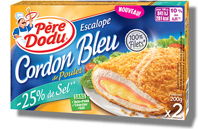 Père Dodu est le premier du marché à proposer désormais sa recette culte avec 25% de sel en moins*, poursuivant ainsi ses efforts vers le bien manger. En diminuant drastiquement  l’apport en sel de ses escalopes cordons bleus, et toujours avec des taux de matières grasses  les moins élevées du marché, Père Dodu vous invite à savourer votre recette préférée sans  culpabiliser, et avec le plus grand plaisir ! Déjà sans huile de palme et sans exhausteur de  goût, les escalopes cordons bleus de poulet Père Dodu, c’est de la viande 100% filets, du  fromage fondant, du jambon au bon goût fumé et une chapelure toujours aussi  croustillante. Un régal pour les gourmands, et un gage de qualité pour les mamans.