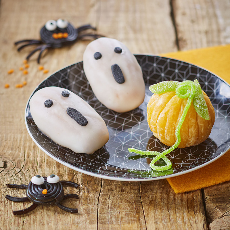 ④• Dresser 2 Madeleines Fantôme par assiette, avec une clémentine épluchée en guise de citrouille. Placer sur le dessus du fruit un bonbon fil vert pour simuler la tige de la citrouille.