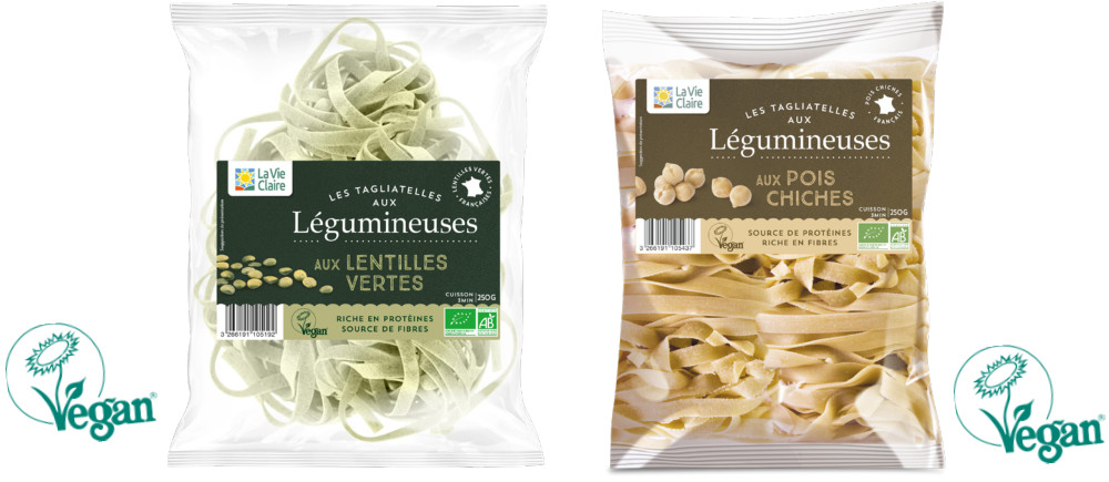 À base de lentilles vertes ou de pois chiches bio, les tagliatelles fraîches La Vie Claire sont fabriquées dans le Vaucluse. Sources de protéines et de fibres, elles sont disponibles au rayon frais et proposent une alternative protéinée 100% vegan aux pâtes classiques. Une façon innovante et originale de consommer des légumineuses !