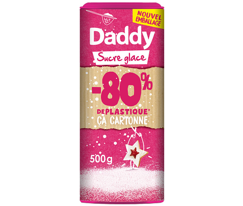 Daddy poursuit ses actions environnementales engagées depuis plusieurs années : la poche souple emblématique de la marque est déjà passée du plastique au papier kraft non blanchi recyclable, en sucrant au passage 72% du plastique de son emballage ! C’est maintenant au tour de la saupoudreuse !