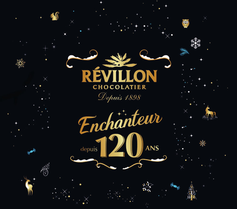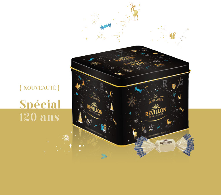 À l’occasion de ses 120 ans, Révillon Chocolatier dévoile sa boîte Collector garnie de papillotes au chocolat noir, lait et blanc sélectionnées parmi ses recettes les plus gourmandes.