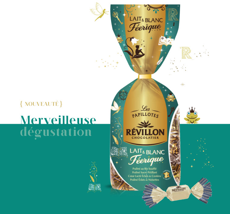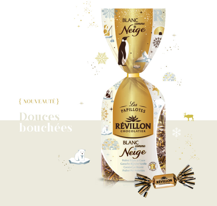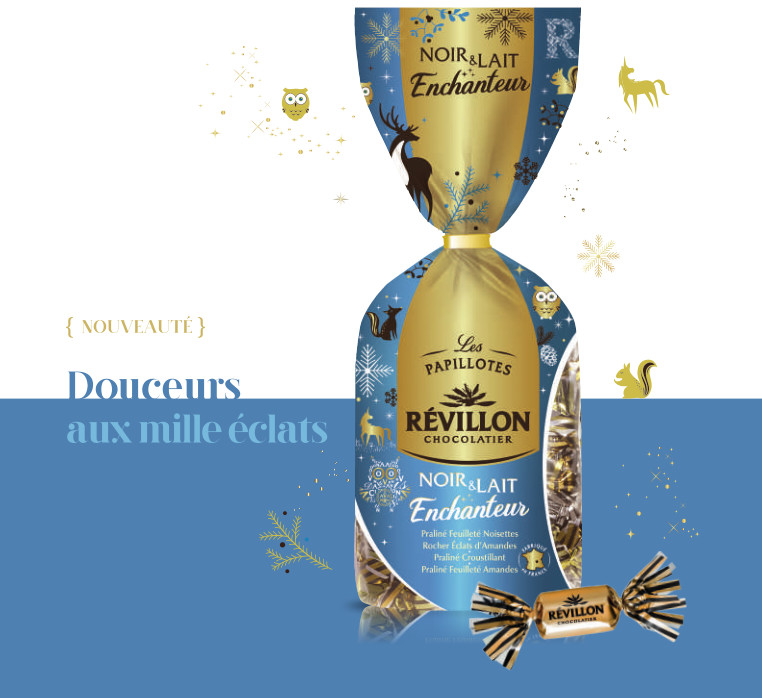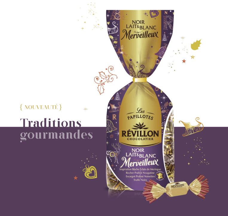 Révillon Chocolatier revisite les incontournables douceurs et desserts que chacun attend avec impatience à Noël. Escargots, rochers, truffes et bûches se réunissent sous forme de papillotes dans un même écrin pour de grands moments de gourmandise sans limite. Les recettes variées au chocolat noir, blanc et au lait intègrent le fondant de la ganache, la subtilité du praliné, le croquant de la nougatine et le croustillant de la meringue pour des sensations intenses et magiques !