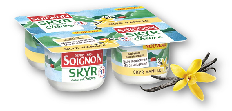 Après le succès de ses versions nature et myrtille, SOIGNON enrichit sa gamme de SKYRS avec une nouvelle création à la VANILLE qui allie la DOUCEUR caractéristique du LAIT DE CHÈVRE à la gourmandise de la vanille. Sa texture ONCTUEUSE et RASSASIANTE en fait un allié précieux pour les petits creux, tandis que sa RICHESSE EN PROTEINES et l’ABSENCE de MATIÈRES GRASSES séduiront les plus attentifs à leur ÉQUILIBRE ALIMENTAIRE.
