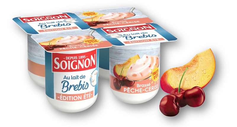 Pour célébrer la saison printemps-été, SOIGNON propose une ÉDITION LIMITÉE qui marie la GOURMANDISE naturelle du bon LAIT DE BREBIS aux saveurs ensoleillées de PÊCHE et de CERISE. Ce duo fruité, offre une véritable explosion de fraîcheur en bouche, invitant à redécouvrir toute la générosité des MORCEAUX DE FRUITS d’été.