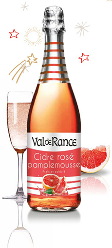 Pour une dose de fraîcheur et de « peps » durant les fêtes, Val de Rance a élaboré une association originale entre le cidre rosé et le jus de pamplemousse. En bouche, le cidre rosé pamplemousse offre une note tonique très fraîche. Fruité et acidulé, il apporte des notes de fruits rouges au nez, tout en restant léger et sucré en bouche. Avec sa couleur et ses saveurs, le cidre rosé pamplemousse est une boisson festive et élégante singulièrement appréciée des femmes.