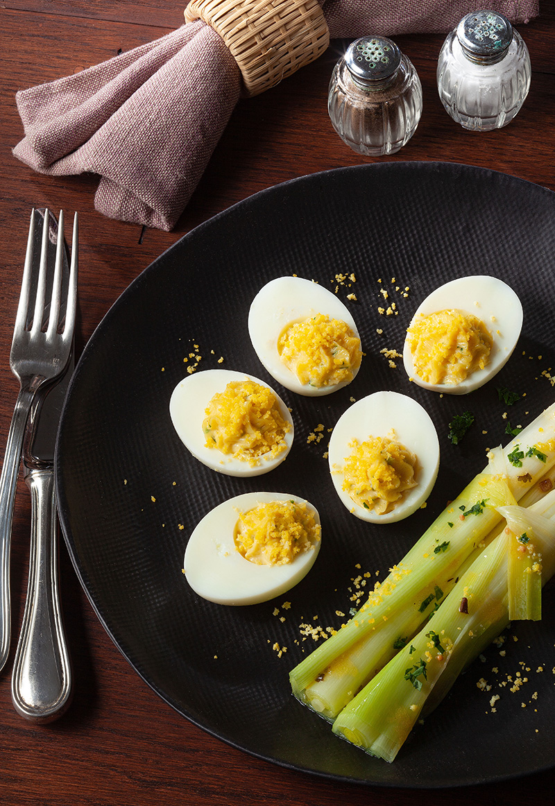 Réserver au frais et servir les « œufs mimosa » comme dans les grandes brasseries avec des poireaux vinaigrette !