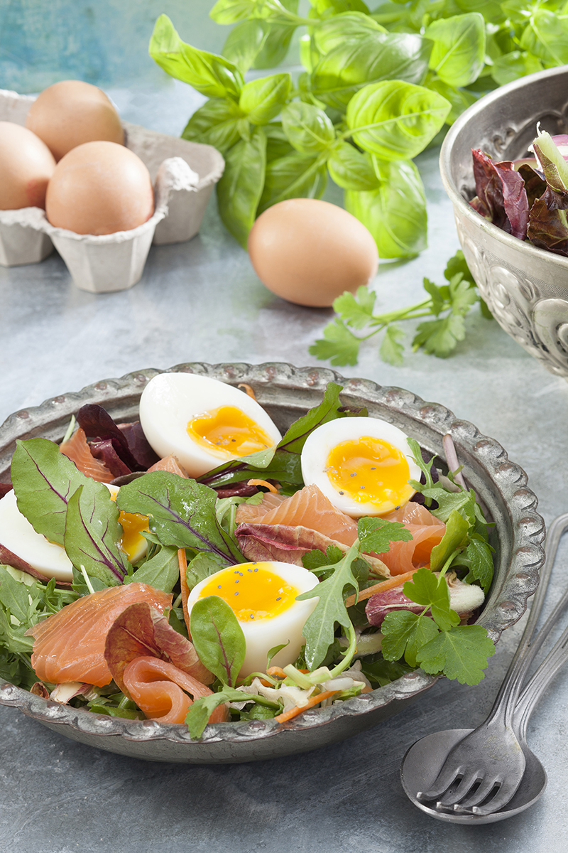 Les bistrots « tendance » fleurissent un peu partout dans notre pays, et c’est tant mieux, car ils proposent de nouveau nos recettes préférées. En effet, pour notre plus grand plaisir ils remettent au goût du jour, l’œuf mayo, les œufs mimosa, les omelettes et les œufs mollets présentés façon assiettes gourmandes. Notre recette d’œufs mollets interprète cette tendance, avec du saumon fumé sur mesclun de petites pousses de salades. À noter que cette suggestion est très équilibrée au plan nutritionnel.