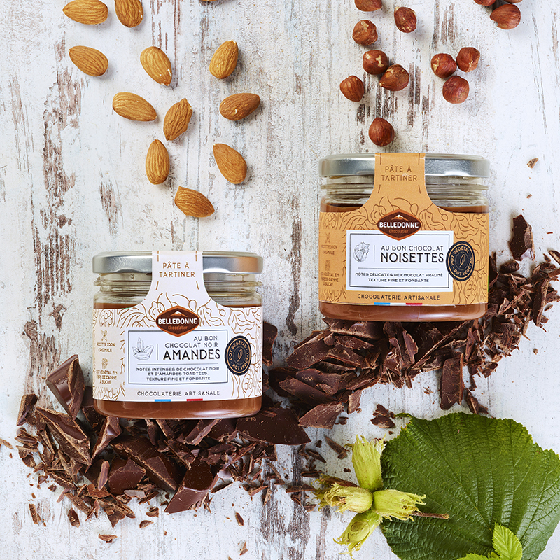 Nos chocolatiers ont créé de délicieuses recettes de pâtes à tartiner dont le 1er ingrédient est le chocolat. Aux noisettes ou aux amandes, leur texture crémeuse fera fondre les amateurs de chocolat. Belledonne a choisi un emballage inédit, un pot végétal qui est issu de la revalorisation d'un résidu de la canne à sucre (la bagasse = déchet de la canne après extraction du jus) et fabriqué en France. Il est aussi 5 fois plus léger qu'un pot en verre classique.