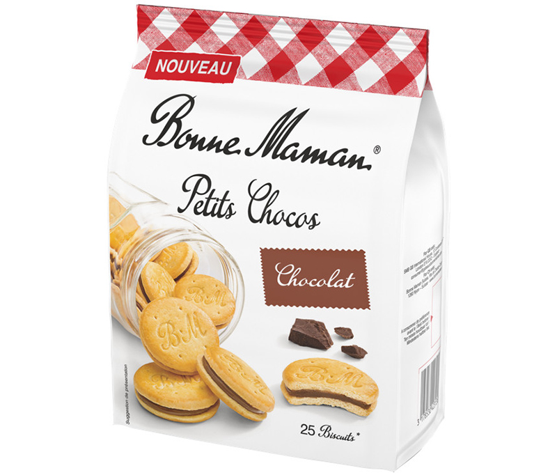 Grâce à son inimitable savoir-faire et à la qualité de ses ingrédients, Bonne Maman® offre un nouveau plaisir réconfortant à toute la famille. Après le petit cookie aux pépites de chocolat, la tartelette chocolat caramel et la petite galette chocolat au lait, Bonne Maman® imagine les Petits Chocos : deux biscuits sablés croustillants avec un cœur onctueux au chocolat (30%). Une douceur fondante dans un format généreux de 25 petits biscuits à partager en famille ou entre amis.
