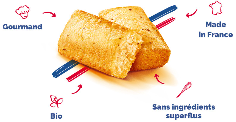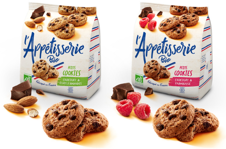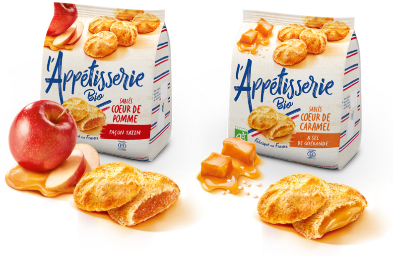 Deux recettes toutes nouvelles au rayon bio : des biscuits à la texture à la fois croustillante et fondante, où une pâte sablée enferme un coeur gourmand, au caramel à la pointe de sel de Guérande, ou à la compotée de pommes façon tatin. Ces petits biscuits sont proposés par environ 20 dans un format snacking.