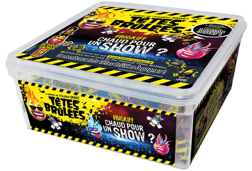 « Chaud pour un Show ? », c’est une boîte entière de fun à partager, spécialement pour fêter Carnaval, le 2ème temps fort de la confiserie après Halloween. 3 Français sur 4 déclarent d’ailleurs consommer des aliments sucrés pendant le Carnaval 2. Cette boîte exclusive propose un large assortiment de bonbons Têtes Brûlées emballés individuellement pour partager des moments à sensations et se défier entre amis avec des billes et des barres (Billes Pong, Barres de Rire, Kitach Ki…) !
