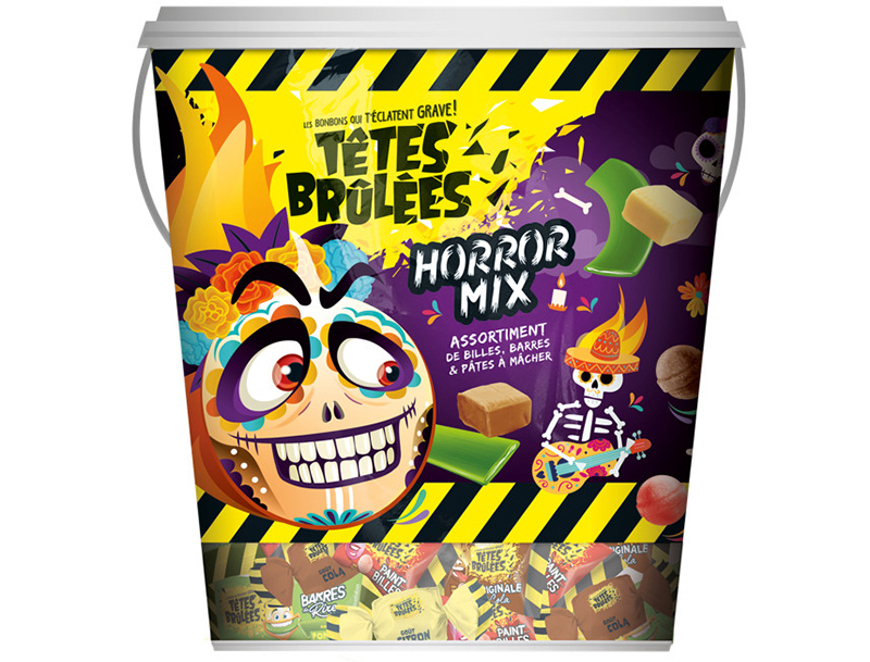 Ce seau contenant une fine sélection d’incontournables Têtes Brûlées : un mix de barres, billes et pâtes à mâcher est placé sous le signe des âmes joyeuses et des papilles en ébullition grâce à son design festif et coloré. En effet, Halloween, c’est aussi le symbole de la fête et la convivialité, l’occasion de partager avec ses proches des moments inoubliables de rire et … de frayeurs.