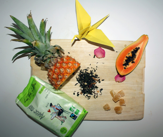 Thé vert*, gingembre confit*, papaye*, arôme d’ananas*, pétale de rose*, arôme de vanille*