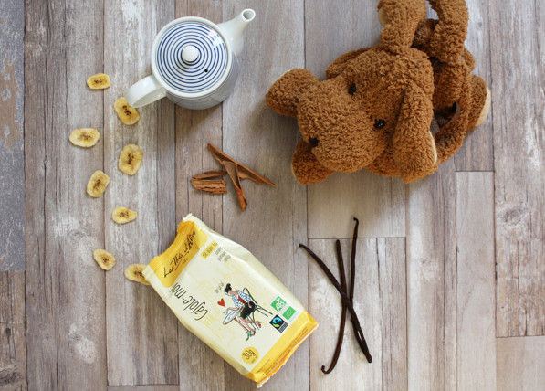 Thé blanc*, banane*, guimauve*, cannelle grattée*, arôme de vanille*, cacao cosse*, pétale de matricaire*