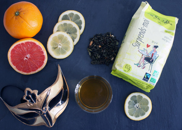 Thé vert*, zeste de citron*, zeste de pamplemousse*, zeste de bergamote*, arôme de bergamote*, bouton d’orange bigaradier*, feuille d’orange bigaradier*, arôme d’orange*, arôme de citron*
