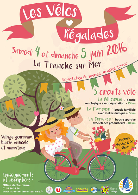 À l’occasion de la fête du vélo, samedi 4 et dimanche 5 juin 2016, l’Office de Tourisme de la Tranche-sur- Mer organise son 1er événement : un week-end découverte des saveurs locales à bicyclette. En partenariat avec des associations tranchaises, trois boucles à vélo sont proposées tout au long du week-end :