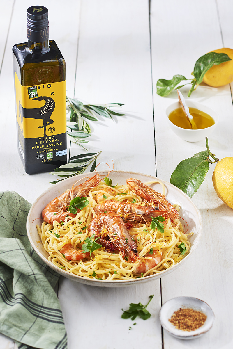 Servir les pâtes accompagnées des gambas et de la sauce citron avec quelques brins de persil et un filet d’huile d’olive.
